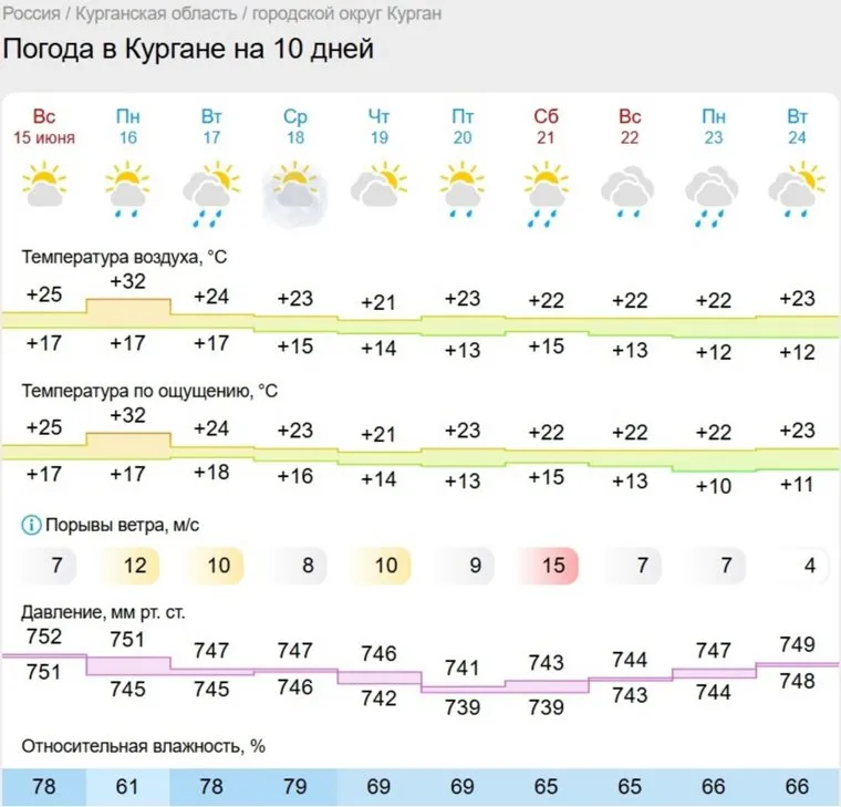 «Последним жарким днем станет понедельник, 16 июня, когда столбик термометра поднимется до 32 градусов. Однако уже со вторника в Курган придет период прохлады с температурами воздуха около 21-23 градусов в дневное время и до 12-15 в ночное. Дождей не прогнозируется только в среду и четверг, во все остальные дни вероятны осадки. Во вторник и субботу не исключены ливни», — сообщается на сайте Gismeteo.