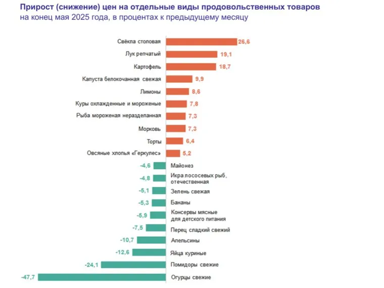 «На конец мая 2025 года в Курганской области упали цены на: огурцы (на 47,7%), помидоры (24,1%), яйца куриные (12,6%), сладкий перец (7,5%), апельсины (10,7%). Подорожала свекла столовая (на 26,6%), лук репчатый (19,1%), картофель (18,7%)», — написано в инфографике Свердловкстата.