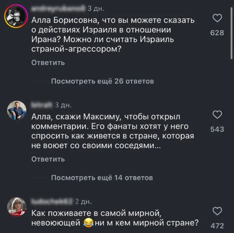 «Алла Борисовна, что вы можете сказать о действиях Израиля в отношении Ирана? Можно ли считать Израиль страной-агрессором?» — написал один из пользователей. Соответствующий вопрос он задал под одним из последних постов певицы.