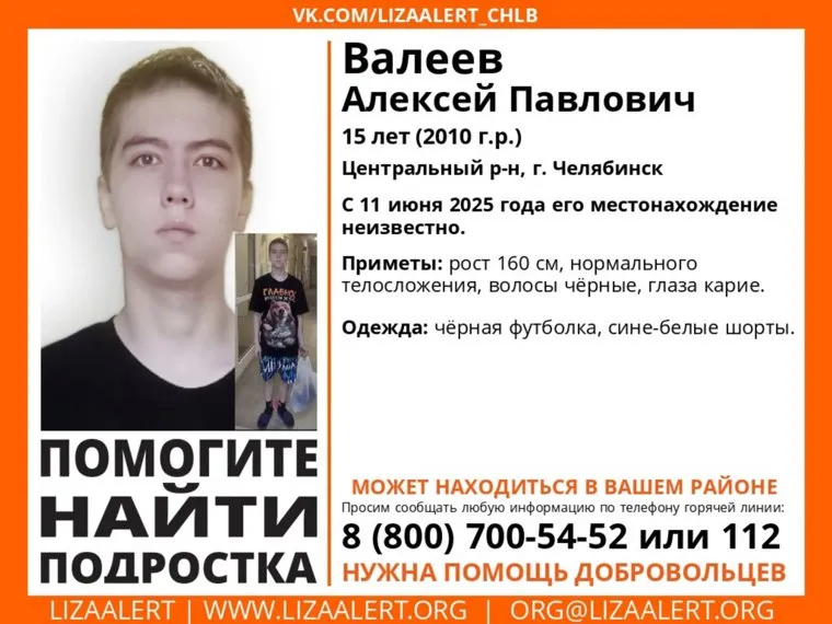 «Алексей Павлович Валеев, 15 лет (год рождения — 2010), Центральный район Челябинска. С 11 июня 2025 года его местонахождение неизвестно», — говорится в ориентировке, опубликованной поисковым отрядом «ЛизаАлерт».