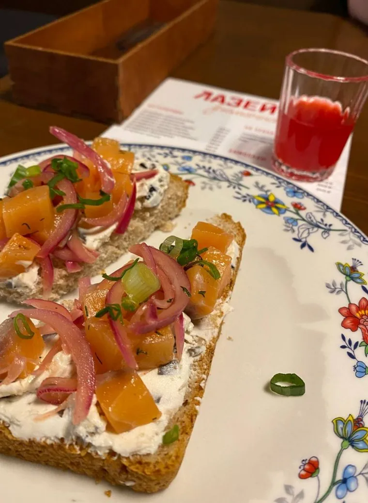 Как и положено, в рюмочной весьма минималистичное меню: бутерброды, салаты, горячее, а из напитков — три вида настоек, разливное пиво, квас и лимонады. Все рассчитано на «быстро выпить, перекусить и уйти». Касаемо стоимости: например, за тарелку жаренной картошки с грибами просят 350 рублей, а порция селедки под шубой обойдется в 250 рублей. Оба блюда, которые мы попробовали, оказались вполне приемлемыми на вкус. А вот лимонады не впечатлили. «Есть ощущение, что напиток сообразили, разбавив сироп водой», — отмечают дегустаторы. Кстати, посуда отличается от привычной ресторанной, тарелки в рюмочной украшены цветочным орнаментом. «Лимонад „яблоко и щявель“ — такое увидели в меню. Не понятно, написали ли так намеренно или все-таки опечатка», — недоумевают журналисты.