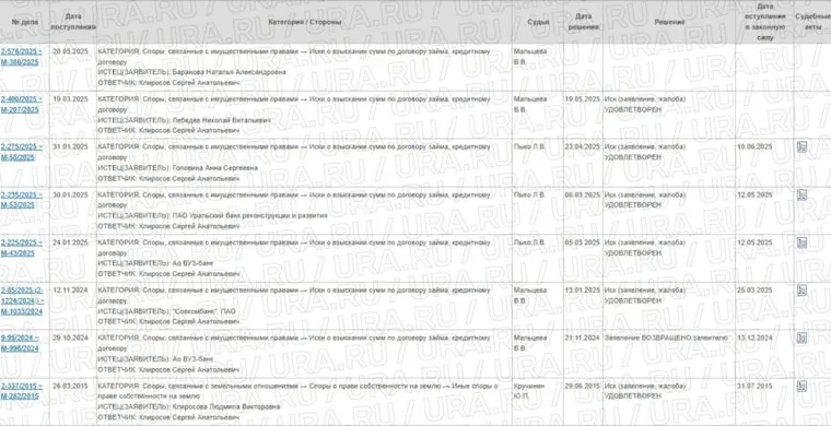 «Взыскать с Клиросова Сергея Анатольевича в пользу ПАО „Совкомбанк“ задолженность по кредитному договору в размере 2 373 969 рублей... Обратить взыскание на предмет залога — автомобиль NISSAN PATROL 2014 года путем продажи с публичных торгов», — говорится в материалах одного из дел. В судебном порядке с Клиросова также взыскали задолженность представители еще двух банков, а также частное лицо, у которого спикер думы брал деньги взаймы. Всего он задолжал 4,6 млн рублей.