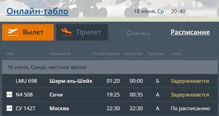 «Вылет по расписанию — в 1 час 20 минут 18 июня. Расчетное время — 0 часов 0 минут 19 июня», — говорится на сайте аэропорта «Баландино».