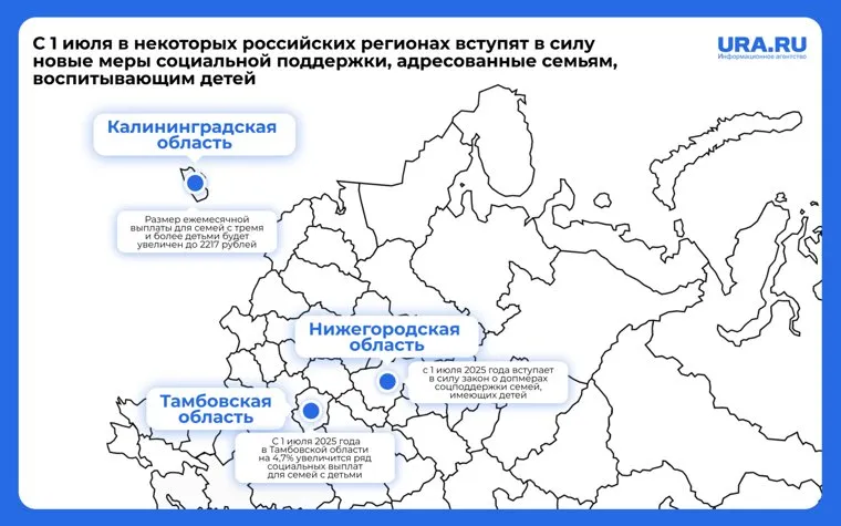 В Калининградской области с 1 июля произойдет увеличение ежемесячной выплаты для многодетных семей: сумма возрастет до 2217 рублей. Кроме того, в Нижегородской области планируется введение дополнительной меры поддержки для семей, имеющих детей.