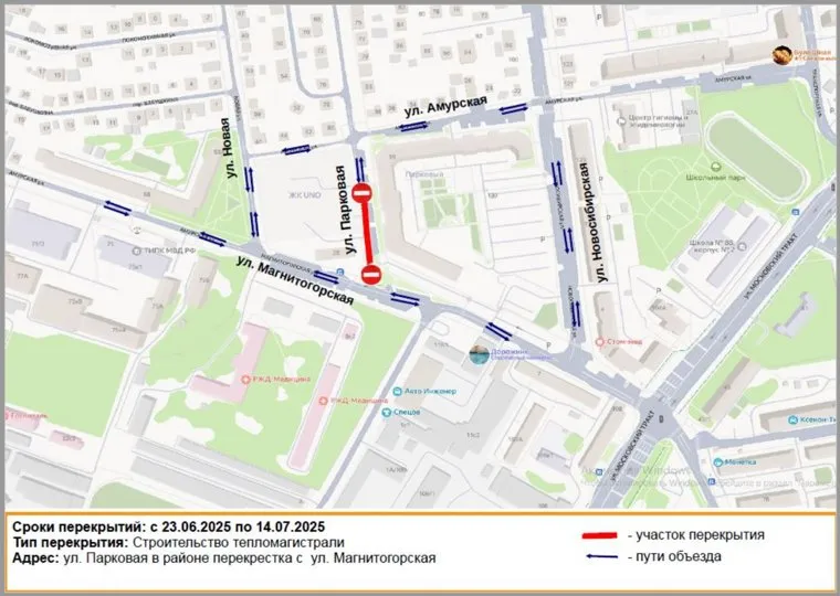 «С 23 июня по 14 июля планируется прекращение движения транспортных средств на улице Парковой в районе перекрестка с Магнитогорской. Причина — работы по строительству тепломагистрали», — сообщили в мэрии.