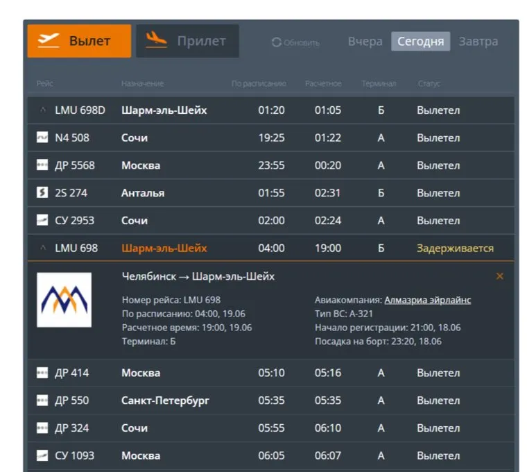 «Рейс LMU 698 Челябинск — Шамр-эль-Шейх [должен вылететь] по расписанию в 04:00. Расчетное — 19:00», — говорится в данных онлайн табло аэропорта. Ранее планировалось, что рейс вылетит в 09:30, далее он был перенесен на 15:00 и 17:00.
