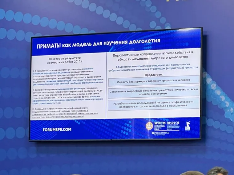 13:09 В качестве примера долголетия рассматриваются пожилые приматы, которых сейчас изучают в Курчатовском комплексе медицинской приматологии. Директор Российского научного центра хирургии имени академика Б.В. Петровского Константин Котенко рассказал, что необходимо оценить биомаркеры старения данных млекопитающих и человека. Отмечается, что обезьяны стали хорошо питаться и стали быстро размножаться. Таким образом, рассказали спикеры на сессии, хорошее питание является залогом решения демографической проблемы.