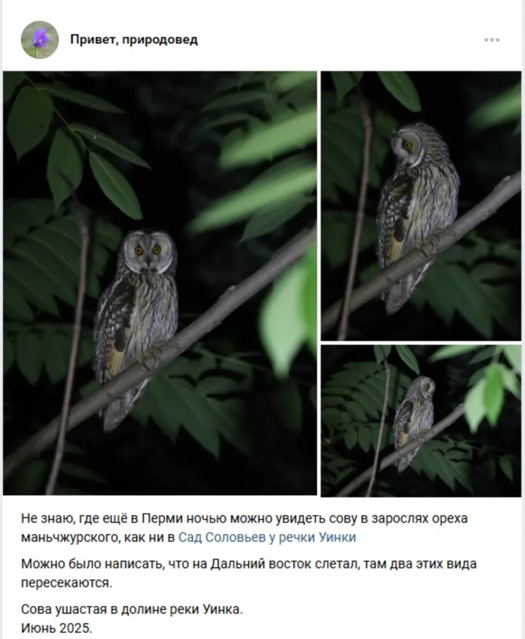 «Не знаю, где еще в Перми ночью можно увидеть сову в зарослях ореха маньчжурского, как ни в Саду соловьев у речки Уинки. Можно было написать, что на Дальний восток слетал, там два этих вида пересекаются», — отметил Исаков в соцсети «ВКонтакте».