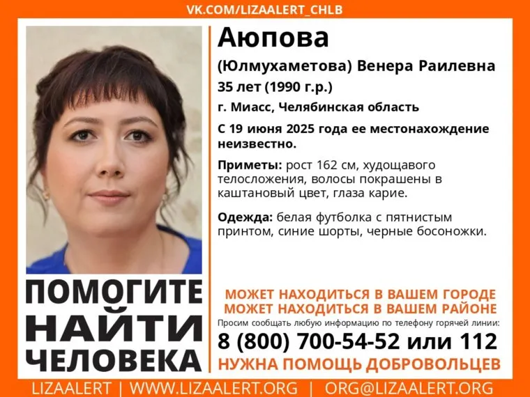 «Пропала Аюпова (Юлмухаметова) Венера Раилевна, 35 лет (1990 г.р.). Миасс, Челябинская область. С 19 июня 2025 года ее местонахождение неизвестно», — сообщил поисковый отряд «ЛизаАлерт».