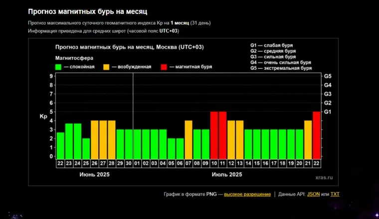 - 29–30 июня — бури пойдут на спад, показатели вернутся к зеленому уровню. Последние дни месяца обещают быть спокойными.