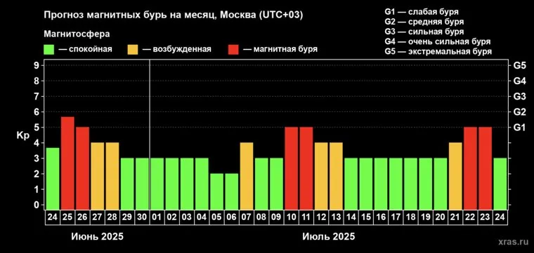 После геомагнитного шторма 25-26 июня магнитосфера Земли несколько дней продолжит оставаться в возбужденном состоянии, пока 29 числа обстановка вновь не станет спокойной. В следующем месяце ученые ожидают магнитные бури 10-11 и 22-23 числа. 7, 12, 13 и 21 июля прогнозируется повышенная геомагнитная активность.