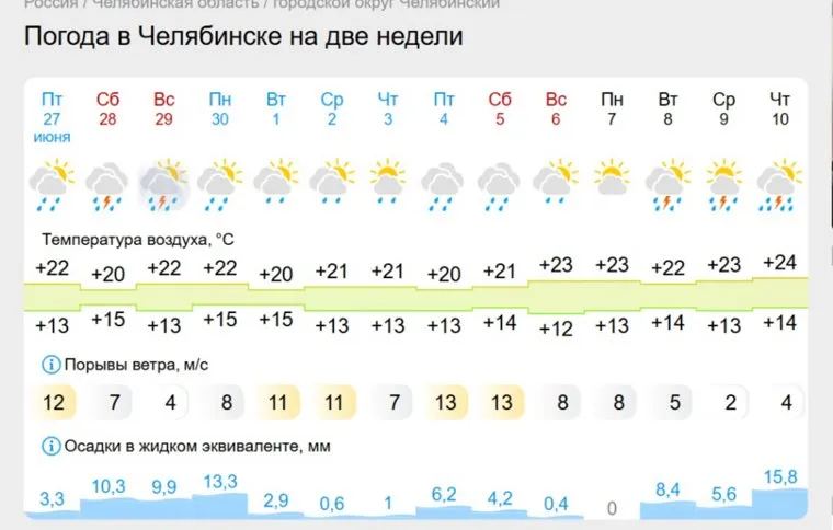 «Жителям Челябинска предстоит пережить затяжные дожди в течение 14 дней. Согласно прогнозам, с 27 июня и до 10 июля в городе практически ежедневно будут идти осадки, иногда с грозами», — говорится в прогнозе метеорологов на сайте «Гисметео».