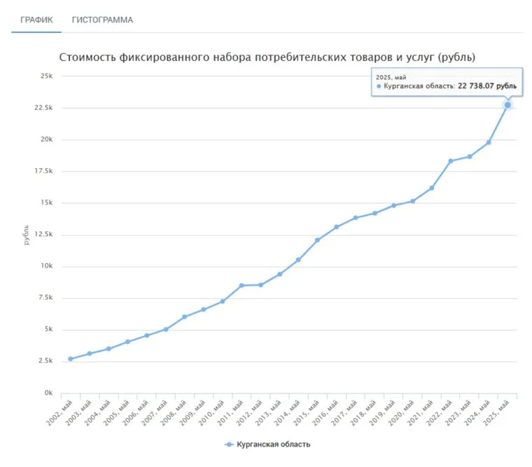 В мае 2025 года стоимость потребительской корзины в Курганской области составила 22 738 рублей. За год она подорожала на 15%. Об этом сообщает Росстат.