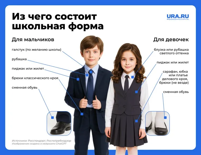 Традиционный набор для мальчиков включает брюки, рубашку и пиджак, для девочек — сарафан, юбку или платье с блузкой. В большинстве школ действует цветовой регламент: темно-синий, бордовый или серый низ сочетается со светлым верхом, передает Mail.ru.