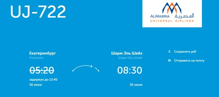 Рейс UJ-722 в курортный город должен был вылететь в 05:20 по уральскому времени и прилететь в 08:20 по местному времени. Сейчас вылет борта из Екатеринбурга намечен на 12:20.