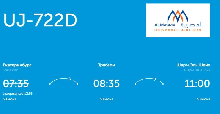 Также задерживается рейс UJ-722D в Шарм-эль-Шейх с пересадкой в турецком городе Трабзон. Самолет должен был вылететь из Екатеринбурга в 07:35, остановиться в Трабзоне в 08:35 и долететь до египетского курорта в 11:00 по местному времени. Сейчас же время вылета борта из Кольцово перенесен на 12:55 по уральскому времени.