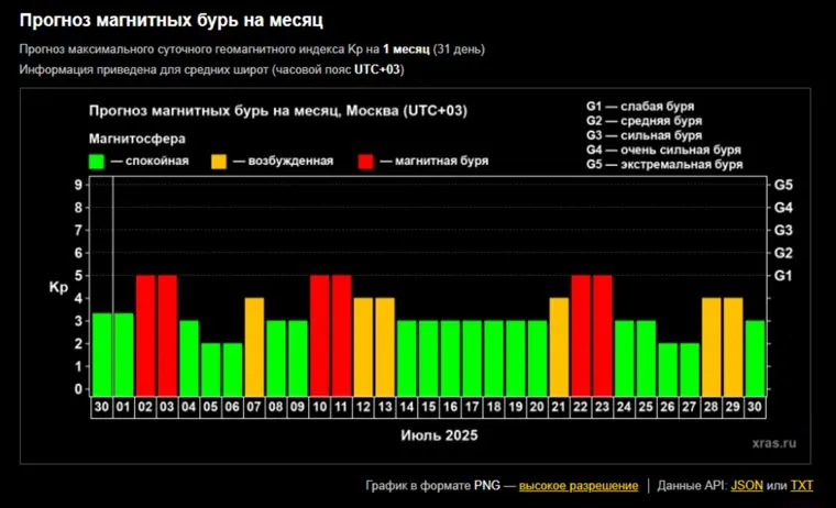 21 июля возможен рост до «оранжевого» уровня (4 балла), а 22–23 июля накроет третья «красная» буря месяца (5 баллов). С 24 по 27 июля спокойно (3 балла), но 28–29 июля возможны «оранжевые» бури (4 балла), а 30 июля снова возвращение к зеленому уровню (3 балла).