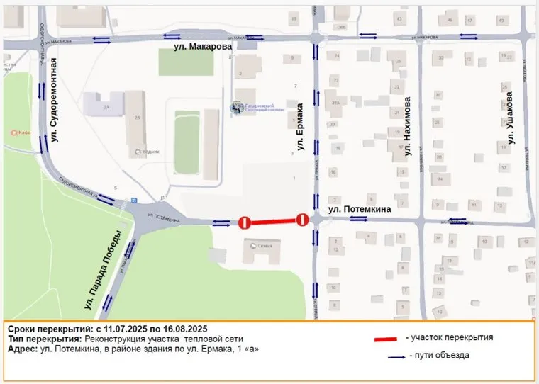 «Движения транспортных средств на автомобильной дороге по Потемкина в районе здания 1а по улице Ермака. Меры приняты в связи с проведением работ по реконструкции участка трубопровода тепловой сети в период с 11.07.2025 по 16.08.2025», — говорится в официальном сообщении ведомства.