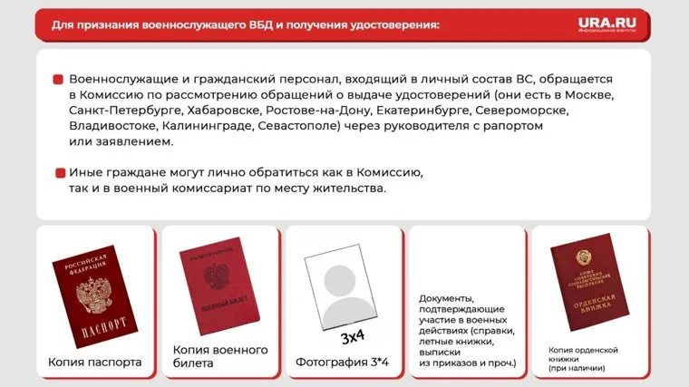 Чтобы получить статус ветерана боевых действий гражданам, находящимся на военной или государственной службе, необходимо подать рапорт своему начальнику или командиру. Демобилизованным нужно написать заявление и подать его через военкомат по месту жительства в соответствующую комиссию. С 2025 года добровольцам удостоверение выдается я автоматически: воинская часть самостоятельно направляет необходимые документы в военкомат.