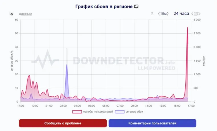 «Жалоб — много (час: 3707, сутки: 20294)», — сообщил сервис downdetector. Согласно данным ресурса, подавляющее большинство сообщений касалось полного отсутствия доступа к сети — таких случаев зафиксировано 91% от общего числа обращений. Еще 5% пользователей рассказали о сбоях в работе мобильных приложений.