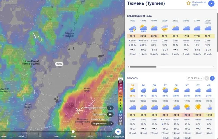«4 июля, Тюмень. Отмечаются сильные осадки см грозой. Завершение грозы ожидается после 18:00», — сообщает сервис.