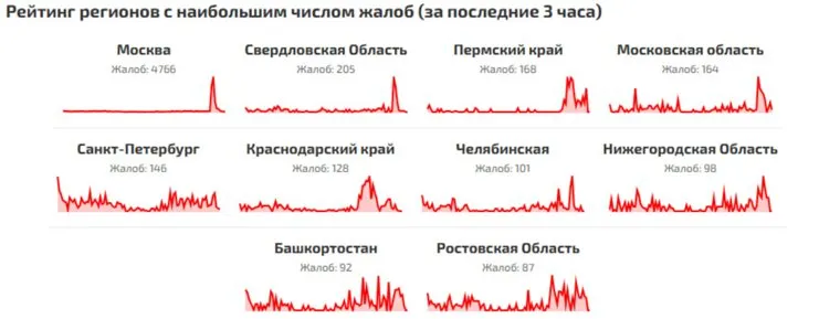 Как следует из данных сайта «Сбой.рф», россияне жаловались на сбои в работе соцсетей, платформ видеохостинга, сайтов банков. Отмечается, что большинство жалоб на сбои оставили пользователи из Москвы (около пяти тысяч). Также нарушения в работе сервисов отмечали в Свердловской области, Пермском крае, Санкт-Петербурге, Краснодарском крае и еще нескольких регионах РФ.