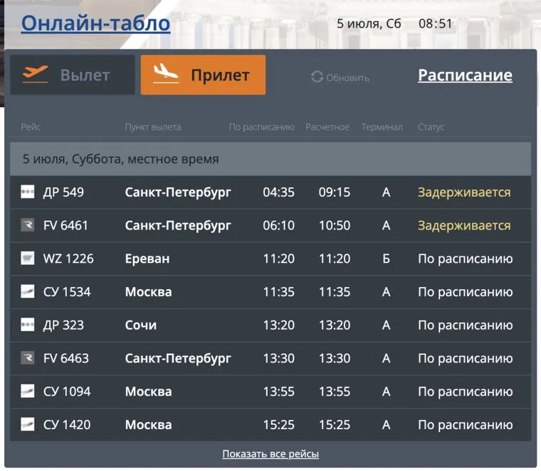 «Рейс ДР 549 Санкт-Петербург — Челябинск авиакомпании „Победа“. Время по расписанию — 04:35, расчетное время — 09:15. Рейс FV 6461 Санкт-Петербург — Челябинск авиакомпании „Россия“. Время по расписанию — 06:10, расчетное время —10:50», — говорится в информации онлайн-табло.