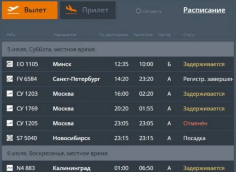 В пермском аэропорту «Большое Савино» несколько рейсов отменены или задержаны вечером 5 июля. Несколько рейсов в Москву, Минск и Калиниград отложены на несколько часов. Два рейса из Перми в Москву и Санкт-Петербург были отменены. Прилет бортов из Москвы также задерживается. Такие данные следуют из онлайн-табло аэропорта.