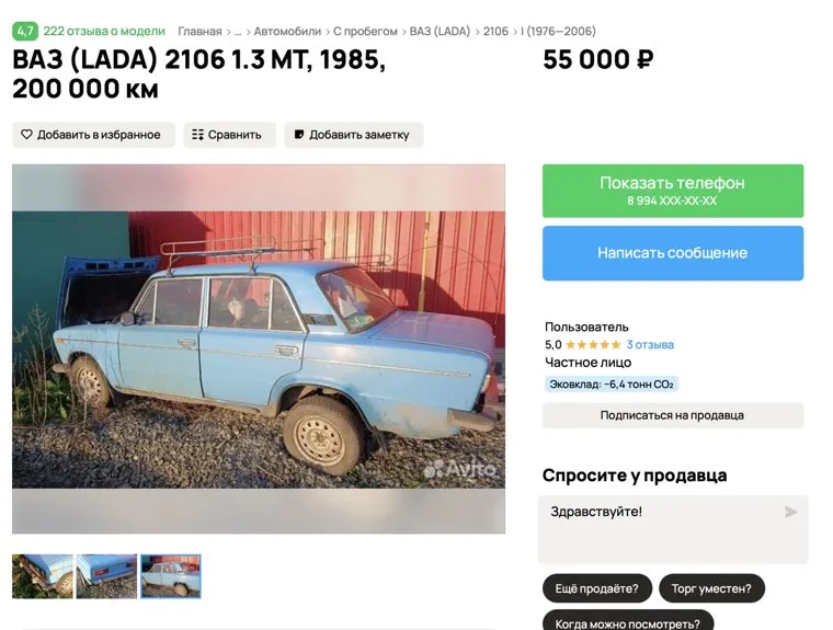 «ВАЗ (LADA) 2106 1985 года выпуска, цена 55 тысяч. Машина на уверенном ходу. Один хозяин. Фаркоп, багажник. На запчасти целиком или как донора. Документов нет. С продажей не спешу. Торг минимальный и только у капота. Могу на „Оку“ поменяться, если не сильно мертвая, возможно с вечным учетом», — говорится в сообщении на сайте «Авито».