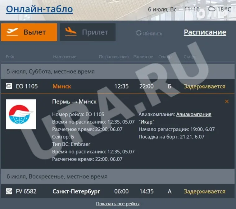 «Рейс EO 1105 Пермь — Минск. Время вылета по расписанию: 12:35, 05.07 Расчетное время: 22:00, 06.07», — указано на сайте аэропорта.