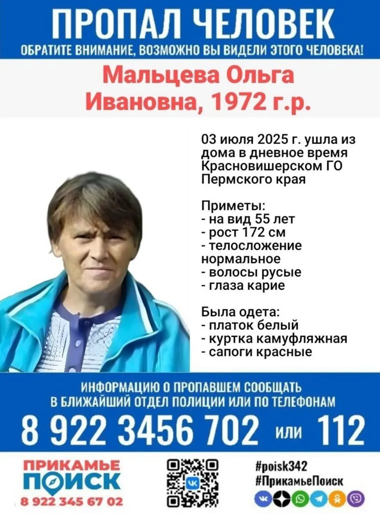 «Пропавшей на вид 55 лет, рост 172 см, нормальное телосложение, русые волосы, карие глаза. Она была одета в камуфляжную куртку, красные сапоги и белую косынку», — указано в ориентировке поискового отряда «ПрикамьеПоиск» в telegram-канале.