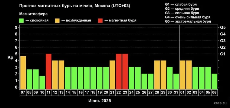 Ближайшая магнитная буря ожидается в пятницу, 11 июля. Также всплеск геомагнитной активности ожидается 22 и 23 июля. 12, 13, 21, 28 и 29 числа ученые прогнозируют повышенную возбужденность магнитосферы. В остальные дни месяца геомагнитная активность должна оставаться на «зеленом» уровне.
