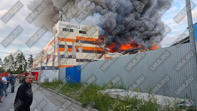 В результате пожара на складском помещении в Екатеринбурге упала кровля здания. Общая площадь пожара составляет 3500 квадратных метров.