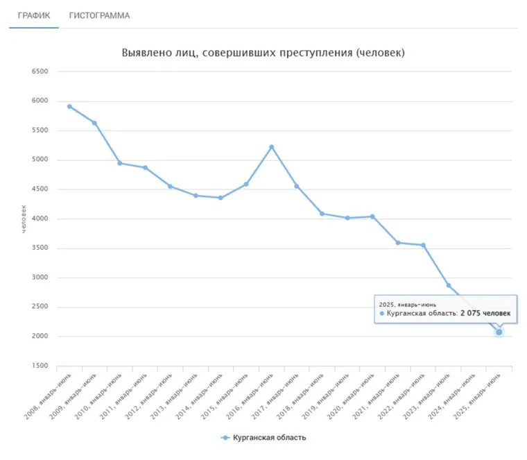 «С января по июнь 2025 года в Курганской области выявлено 2075 лиц, совершивших преступления. В аналогичном периоде 2024 года их было 2475. За 17 лет количество таких лиц сократилось почти в три раза», — говорится в данных МВД России, опубликованных на сайте ЕМИСС.