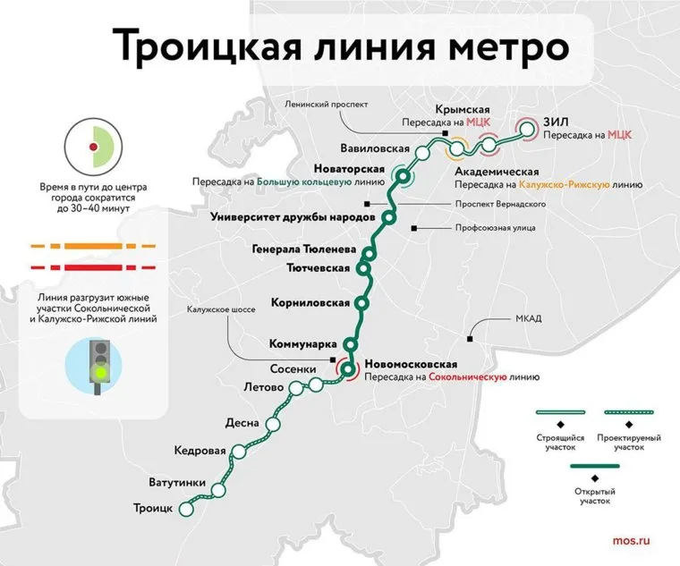 «На Троицкой поезда уже следуют до „Новомосковской“ <...> Линия метро продолжит двигаться вглубь округов. <...> В итоге изумрудная ветка протянется от станции „ЗИЛ“ в Даниловском районе до Троицка <...> до 2030 года», — сообщили в мэрии. Там же отметили, что Троицкая линия будет состоять из 17 станций и протянется более чем на 43 километра — от станции «ЗИЛ» в Даниловском районе до Троицка.