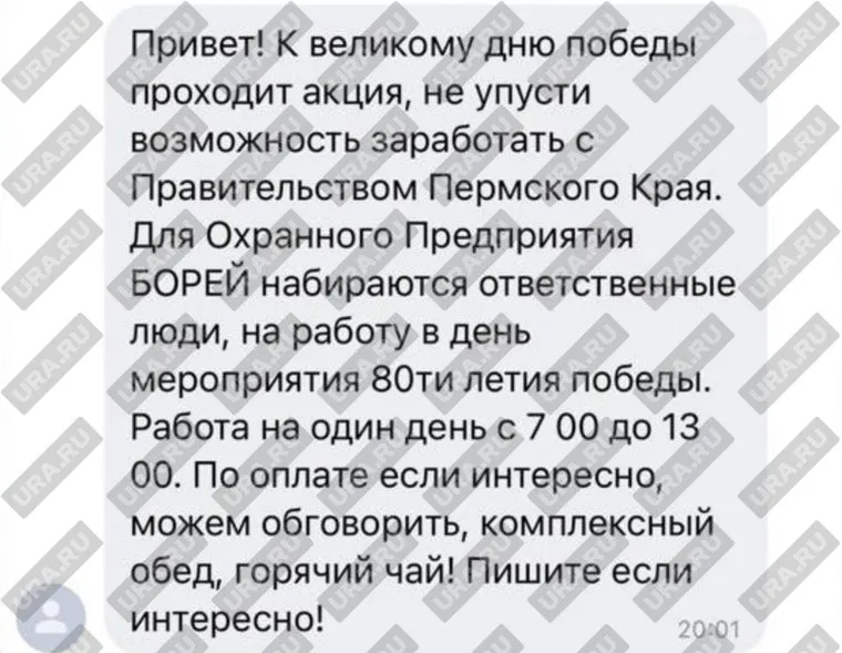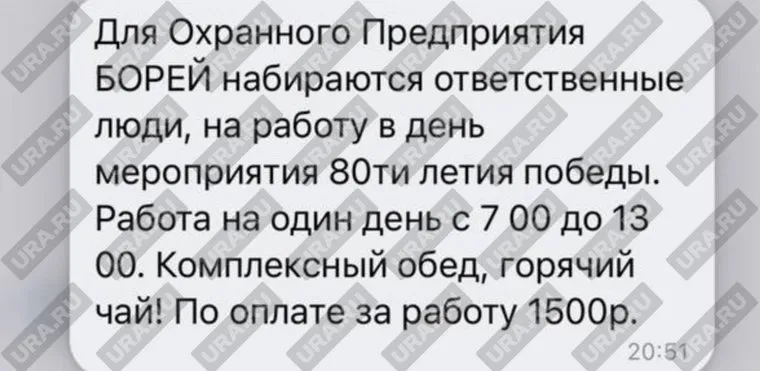 «К великому Дню Победы проходит акция: для охранного предприятия „Борей“ набираются ответственные люди на работу в день проведения мероприятия в честь 8-летия Победы. Работа на один день с 7:00 до 13:00. Оплата обговаривается. Комплексный обед, горячий чай», — сообщалось в смс-рассылке.