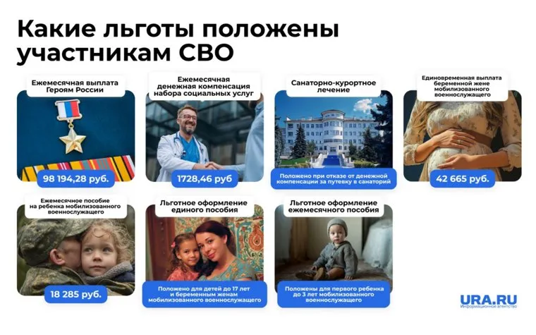 В Государственной Думе рассматриваются инициативы по повышению ежемесячных выплат до уровня прожиточного минимума. Также обсуждается введение льготной ипотеки под 2% годовых с лимитом до 12 миллионов рублей в Москве и шести миллионов в регионах. Также для участников СВО планируется ввести возможность получения бесплатного второго высшего образования по специальностям, связанным с их боевым опытом.