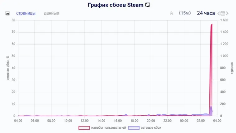 «Фиксируется масштабный сбой в работе Steam — пользователи сообщают, что не могут открыть сайт, войти в аккаунт, загрузить приложение и подключиться к серверу. Основной пик пришелся на вечер, доля жалоб на сбои достигла 75%», — говорится в данных сервиса Downdetector.