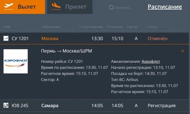 «Кроме того, отменен и обратный рейс из Москвы в Пермь. Самолет планировалось принять в 12:40, после чего время прилета сдвинули на 14:20. Теперь новый вылет указан на 13 июля — самолет должен отправиться в 15:15», — сказано на онлайн-табло пермского аэропорта.