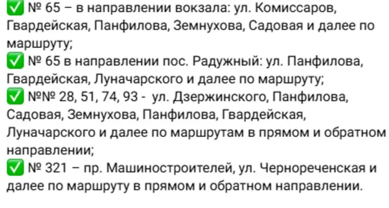 «В связи с ремонтом водопроводной сети в Механическом будет временно ограничено движение. На период проведения ремонтных работ движение автобусов будет осуществляться по следующим маршрутам», — пишет ведомство. Маршрут №65 поедет через улицы Комиссаров, Гвардейская, Панфилова, Земнухова и Садовую; в обратном направлении маршрут пройдет по улицам Панфилова, Гвардейская и Луначарского. Автобусы №28, 51, 74, 93 будут курсировать через Дзержинского, Панфилова, Садовую, Земнухова и Луначарского; автобус №321 — по проспекту Машиностроителей и улице Чернореченской.