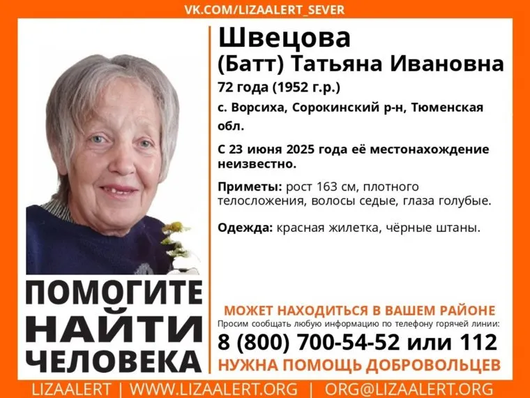 «Пропала Швецова (Батт) Татьяна Ивановна, 72 года. Село Ворсиха, Сорокинский район, Тюменская область. С 23 июня 2025 года ее местонахождение неизвестно», — написали волонтеры.