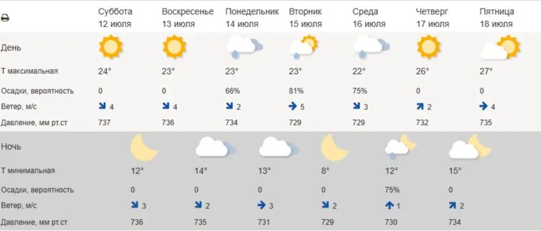 В Екатеринбурге с 12 по 16 июля ночные температуры прогнозируются в пределах 11-14 градусов, дневные — 22-24 градуса. Осадки маловероятны, исключение составляет 15 июля, когда возможен кратковременный дождь.