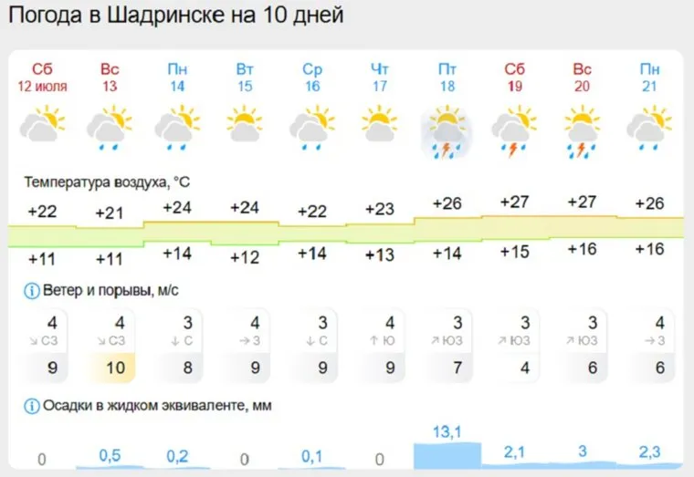 «С 12-го по 21 июля в Шадринске воздух прогреется днем от 21 до 27 градусов тепла, возможны дожди и грозы. Ночью ожидается от +11 до +16 градусов», — сообщается на сайте Gismeteo.
