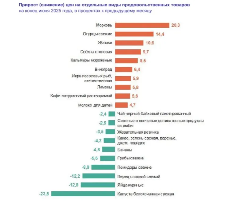 «В Курганской области на конец июня 2025 года подорожала морковь (на 20,3%), огурцы (на 14,4%), яблоки (на 10,6%), свекла (на 9,7%). Подешевела капуста белокочанная (на 23,8%), яйца куриные (на 12,8%), сладкий перец (на 12,2%), помидоры (на 8,8%)», — приводит данные Свердловкстат.