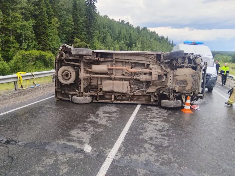 Известно, что микроавтобус ехал из Ханты-Мансийска в Уфу. На месте аварии работают сотрудники ГАИ.