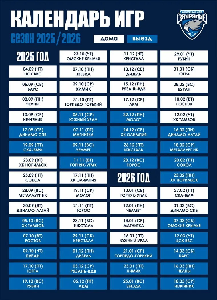 «Начинаем регулярку 4 сентября, завершаем 18 марта. Стартуем четырехматчевой домашней серией против ЦСК ВВС, „Барса“, „Челнов“ и „Нефтяника“. Заканчиваем матчами против этих же соперников, но на выезде. Всего наша команда, как и все другие, проведет 62 матча в регулярном чемпионате 2025/2026: 31 дома и 31 в гостях», — сообщает пресс-служба ХК «Зауралье».