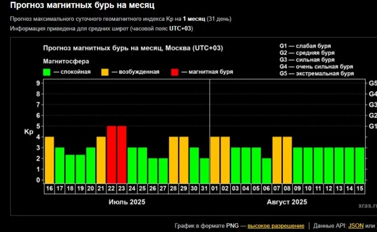 - 30–31 июля — 3 балла, «зеленый уровень». Месяц завершится спокойными показателями, но в начале августа возможен новый рост активности.