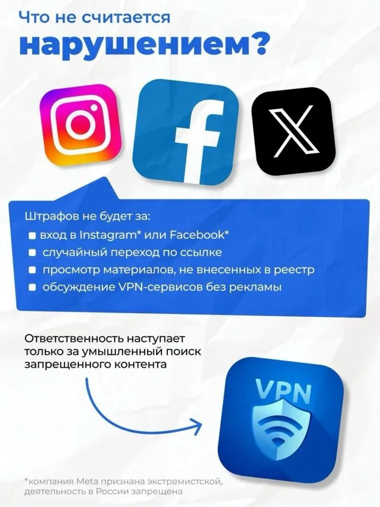 Жители России не будут привлекаться к ответственности за посещение заблокированных в стране социальных сетей, включая Instagram (принадлежит компании Meta, признанной экстремистской и запрещенной в РФ), а также других ограниченных ресурсов при использовании VPN, сообщил Шейкин. По его словам, новый законопроект предусматривает штрафы только за умышленный поиск и распространение материалов, признанных экстремистскими по решению суда и внесенных в соответствующий реестр Минюста.