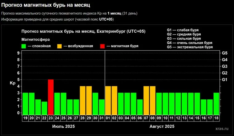Согласно прогнозу, геомагнитные возмущения стоит ожидать 23 июля. По мощности они достигнут уровня G1 (слабая буря). В ближайшие дни (19, 20 и 21 июля) вероятность заметных геомагнитных бурь составляет 7% и меньше.