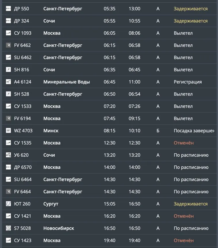 «Рейс ДР 550 Челябинск-Санкт-Петербург перенесен с 05:35 на 13:00. Рейс ДР 324 Челябинск-Сочи перенесен с 05:55 на 10:55. Рейс ЮТ 260 из Челябинска в Сургут запланирован на 16:50 вместо объявленных ранее 15:05», — следует из информации, опубликованной на онлайн-доске международного аэропорта «Курчатов».